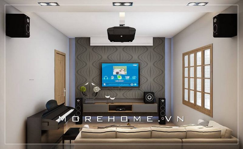 Khi trang trí bằng giấy dán tường với tông màu ghi và họa tiết độc đáo, mảng tường sẽ không còn cứng cố nữa và nổi bật lên trong không gian phòng khách.