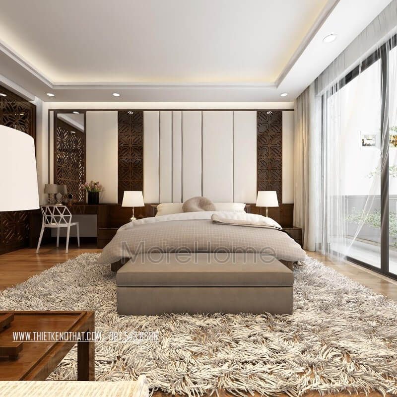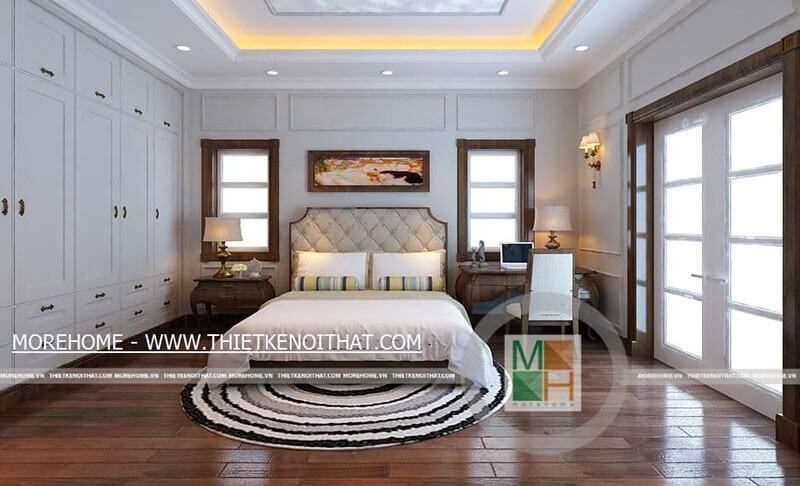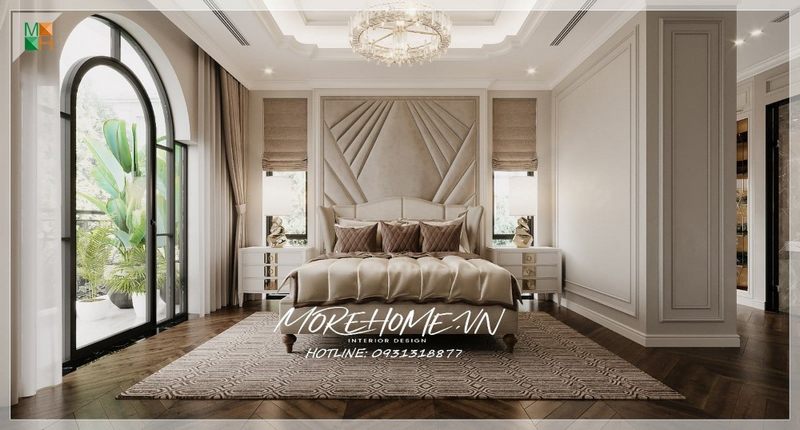 . Phòng ngủ master được bố trí tối ưu trong biệt thự, từ phào chỉ tường và trần nhà đến hệ thống cửa kính đều được chăm chút tỉ mỉ. Những cửa kính này giúp đón ánh nắng và tạo độ thông thoáng cho căn phòng. Nội thất phòng ngủ được làm từ gỗ tự nhiên cao cấp, giúp gia chủ có một không gian nghỉ ngơi hoàn hảo.